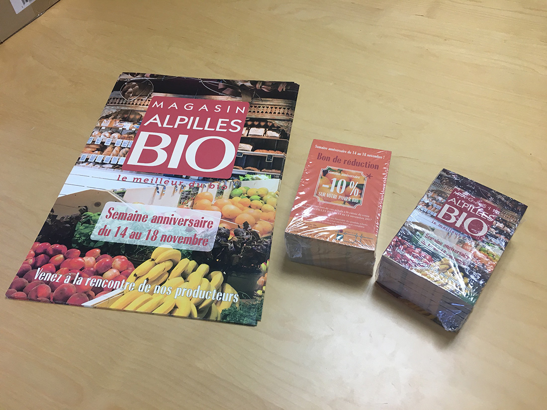 Impression d'affiches et de flyer pour le magasin Alpilles Bio à Saint-Rémy de Provence par l'agence Easy.